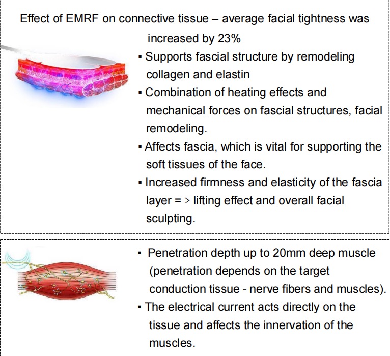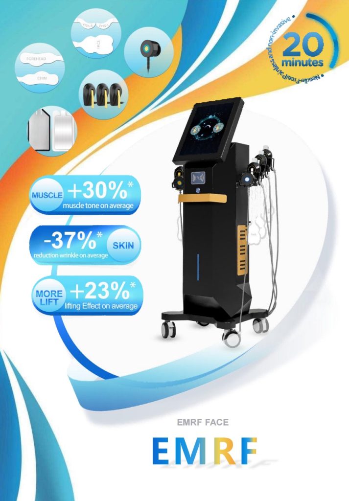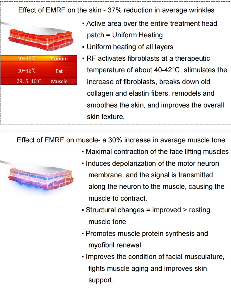 organize. Breaking through the traditional anti-aging technology on the market, it only targets the dermis and fascia and does not affect the muscles.EMRF utilizes the simultaneous application of High Intensity Facial Electromagnetic Stimulation (HIFES) and Synchronized Radio Frequency (RF) technology to affect facial muscles, skin, connective tissue it can simultaneously tighten facial muscles, lift loose skin on cheeks, jaw line and under the chin, Thus reducing wrinkles and improving results!