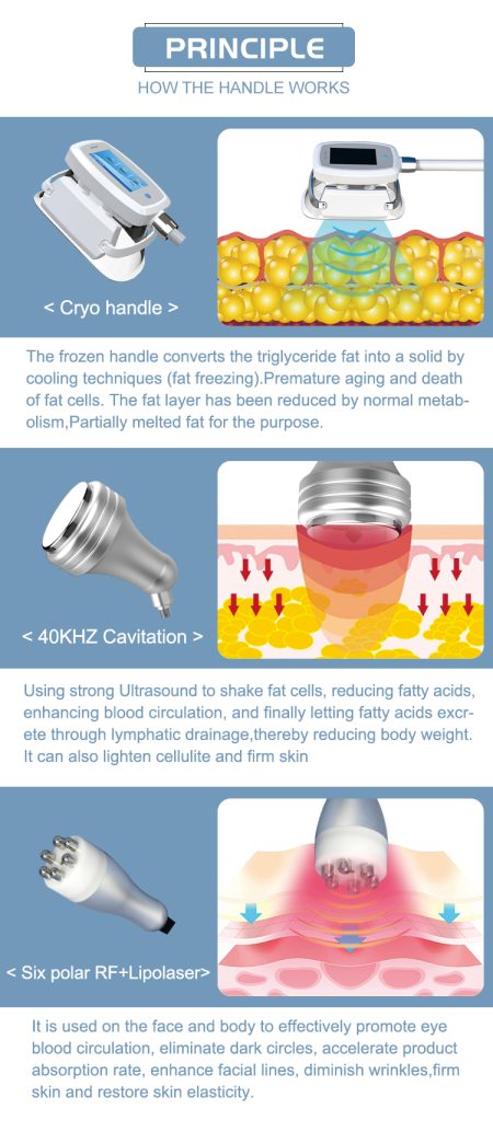 1.The frozen handle converts the triglyceride fat into a solid by cooling techniques (fat freezing).Premature aging and death of fat cells. The fat layer has been reduced by normal metab-olism, Partially melted fat for the purpose.
