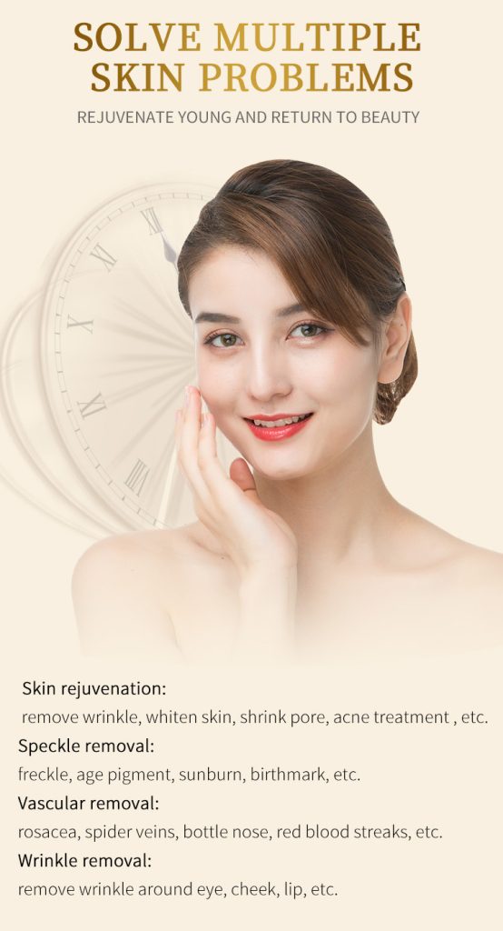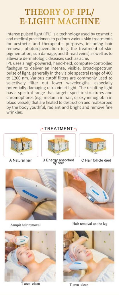 The Intense pulsed light (lPL)is a type of intensive.broadband, coherent light source which has a wavelength spectrum of 420 nm -1200 nm. The light-based componentdelivers optical energy that is absorbed by specificchromophores in the skin, which is converted to heat according to the principle of selective photothermolysisSo lPL’s light affects pigmentations, broken capillariesand hair follicles.In the meanwhile, IPL also give a boost tocollagen production, which can make the skin moreyouthful, radiant and bright and remove fine wrinkles.