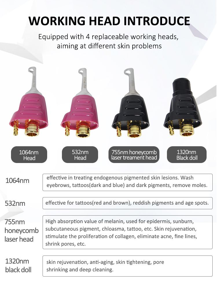 1064nm: effective in treating endogenous pigmented skin lesions. Wash eyebrows, tattoos(dark and blue) and dark pigments, remove moles.