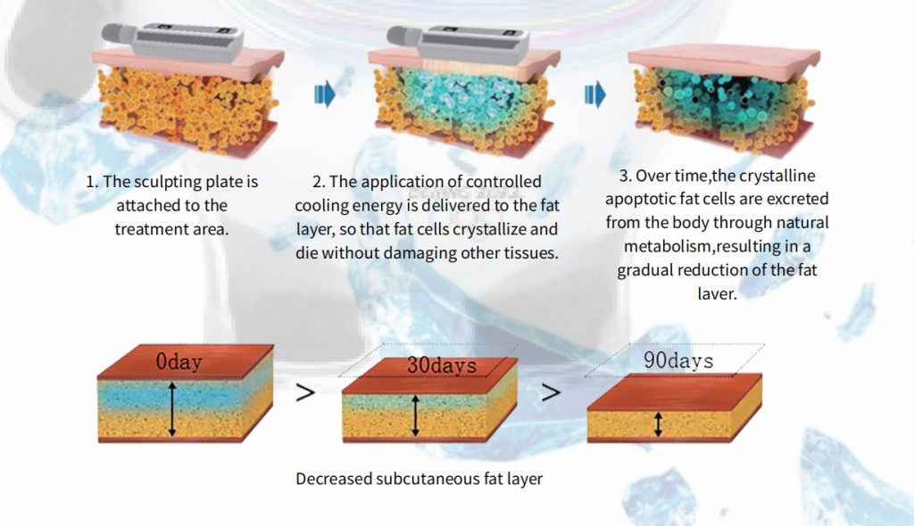 The machine employs a selective and non – invasive freezing method. It utilizes a safe non – invasive cryolipolysis technique, operating at an ideal temperature range of – 5°C to – 11°C. This temperature range selectively induces apoptosis (a natural form of cell death) in fat cells, known as adipocytes. Different from adipocyte necrosis, apoptosis allows fat cells to die in an autonomous and orderly manner. By doing so, it effectively reduces adipocytes while leaving the surrounding tissues unharmed. The process begins when the sculpting plate is attached to the treatment area. Controlled cooling energy is then delivered to the fat layer, causing the fat cells to crystallize and die over time. Subsequently, the crystalline apoptotic fat cells are excreted through the body’s natural metabolism, resulting in a gradual reduction of the fat layer.