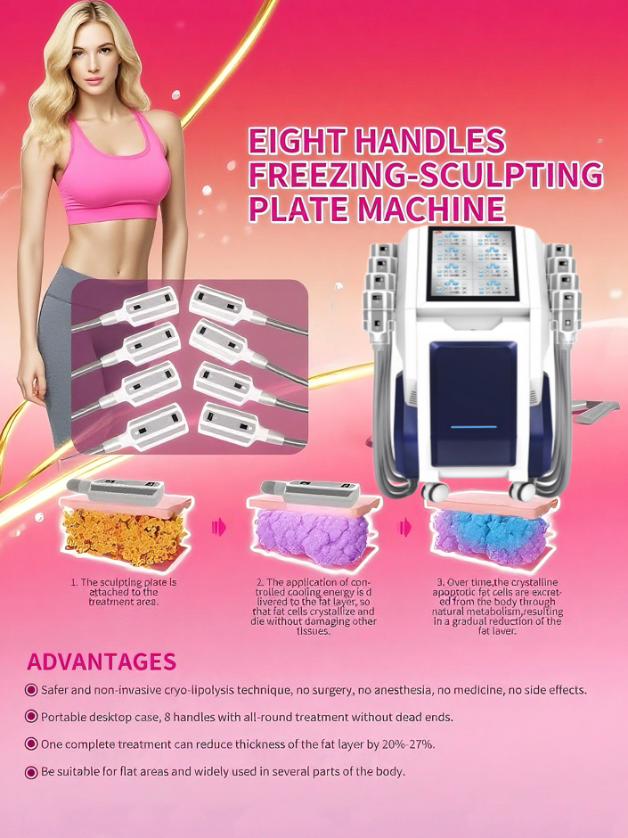 The Eight – Handles Freezing – Sculpting Plate Machine is a revolutionary non – invasive body – shaping device designed for localized fat reduction. This vertical model offers a convenient and effective solution for those seeking to contour their bodies without the need for surgery, anesthesia, or medications.