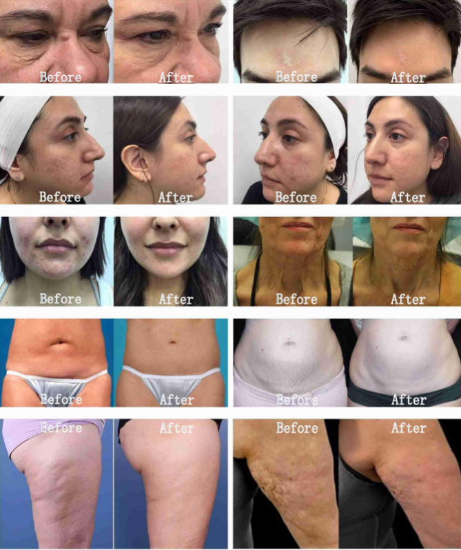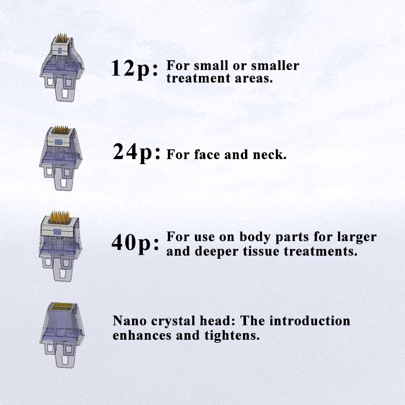 This device is outfitted with four interchangeable probe configurations (12p, 24p, 40p, and a nano – probe). The system allows for free adjustment to set the insulated crystallite head to penetrate the target tissue in the skin at varying depths (ranging from 0.5 – 7mm). It provides minimally – invasive treatment for the remodeling of 8mm – deep subcutaneous adipose tissue. The thermal effect can penetrate up to 7mm into the subcutaneous tissue, with an additional 1mm depth, aiming to remodel collagen and coagulate adipose tissue.